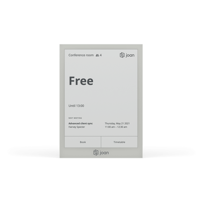 The Joan 6 Pro room scheduler simplifies and optimizes the booking process for office spaces, meeting rooms, and conference rooms by seamlessly integrating with your company’s existing calendar system. Each room that is equipped with a Joan 6 Pro device, features an E-paper display that shows real-time availability of that room. Employees can easily check the status of a room and book it directly through their company’s calendar or from the device itself, making the management of office space more efficient and convenient.