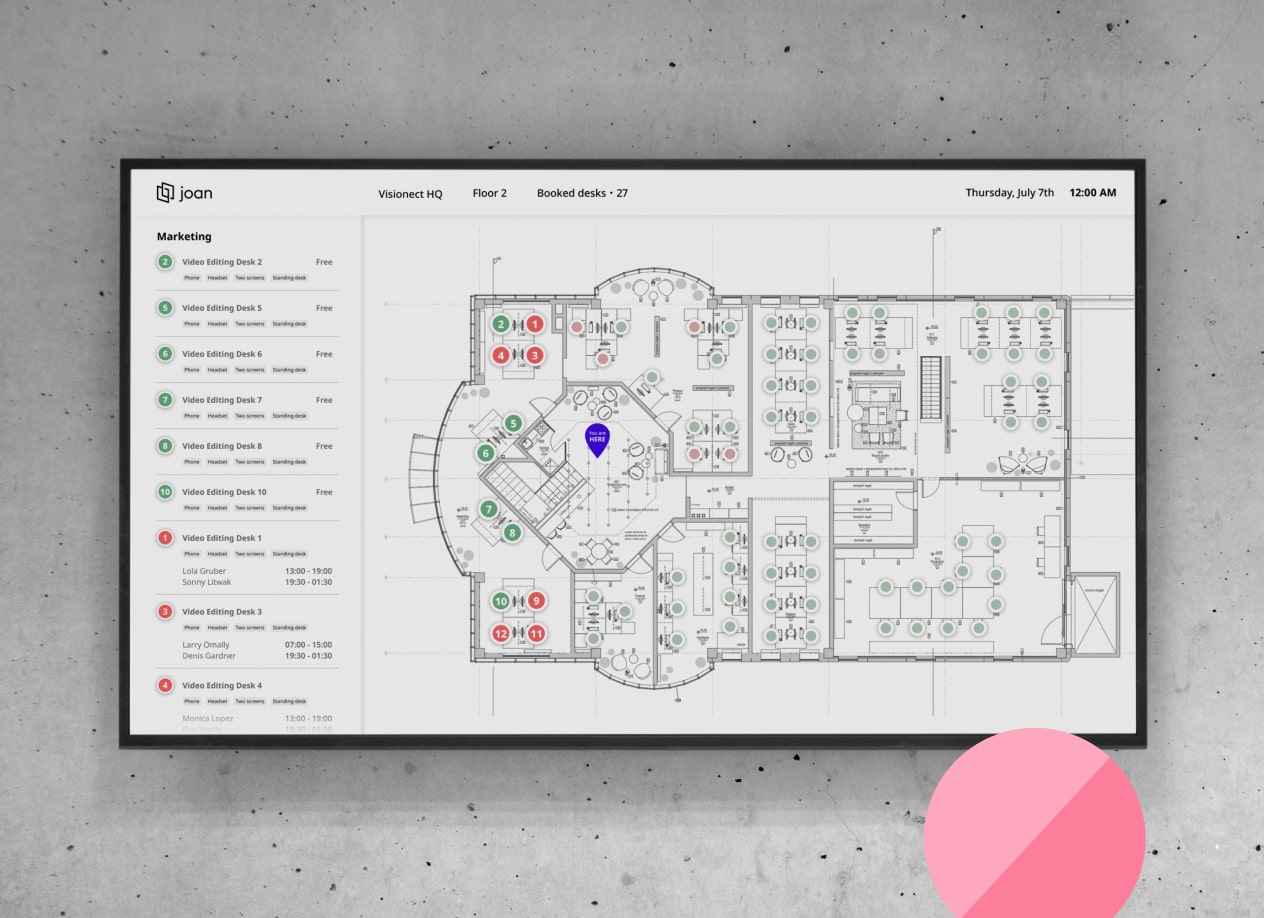 Show your floorplan on a big screen to track bookings, presence, and free spaces — all included in the Joan platform.