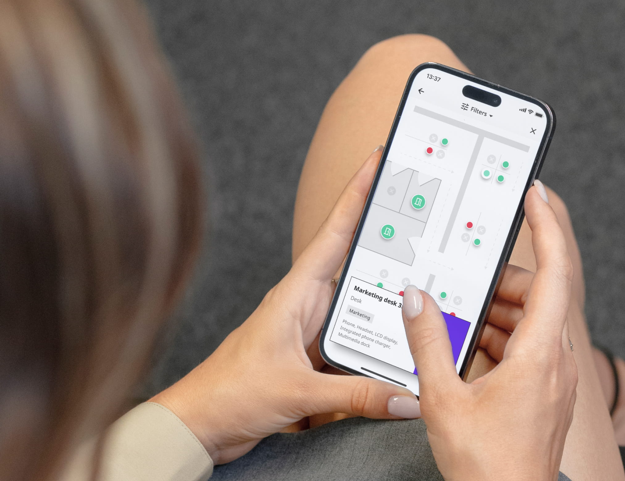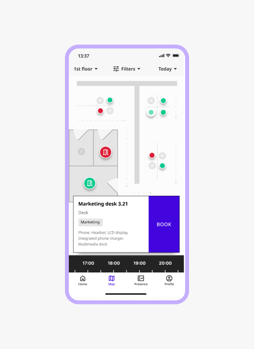 Employees find and reserve a desk in seconds — from the app, the display, or a browser. No spreadsheets, no SharePoint hacks, no “is this desk actually free?” tickets landing in your queue.