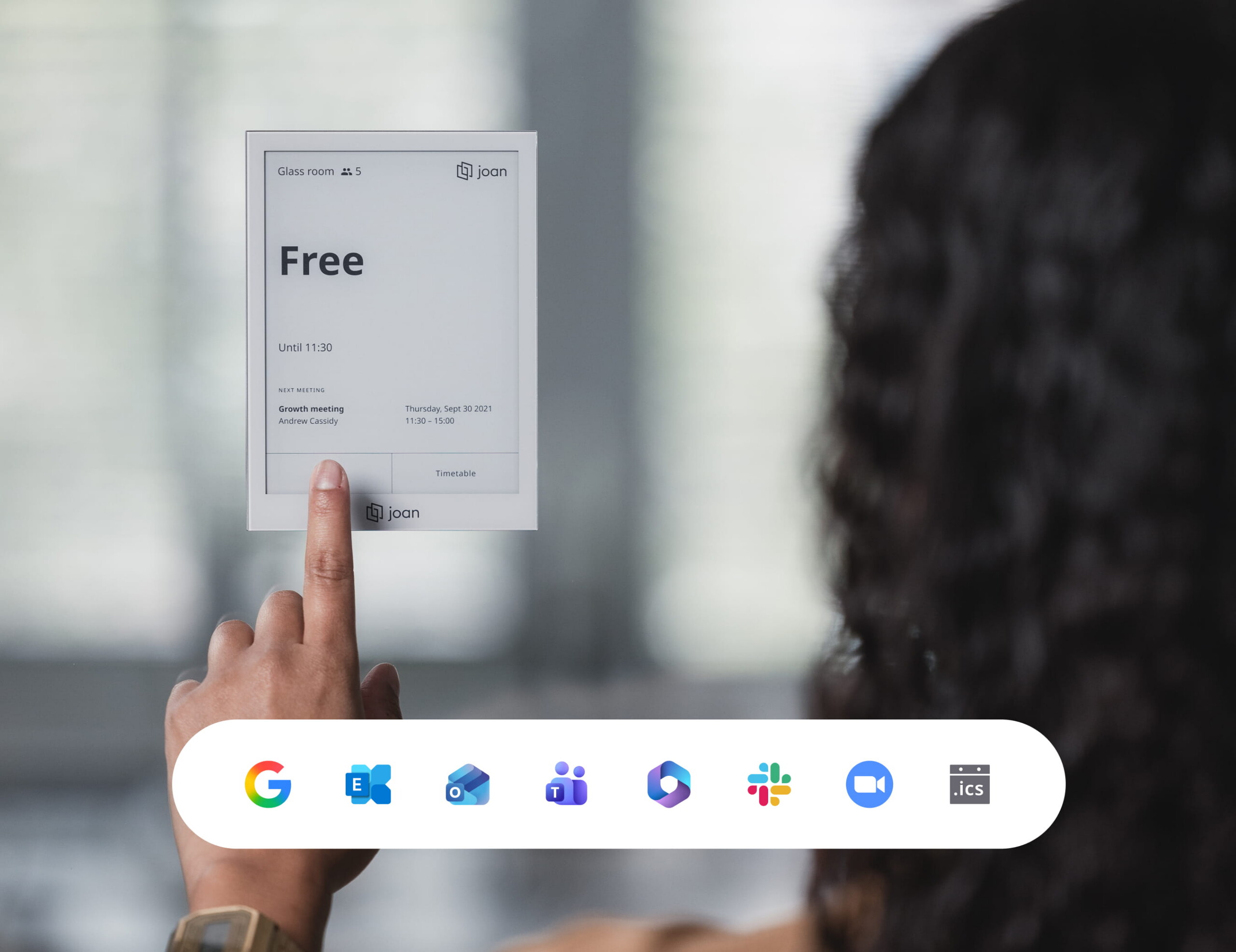 Joan’s e-paper displays run for months on a single charge. They connect to your calendar system, update in real time, and surface in your device management console. When something needs attention, you know before the user does.